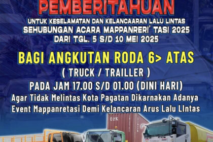 Suara Kotabaru, Tanah Bumbu – Polres Tanah Bumbu mengeluarkan pemberitahuan terkait pembatasan lalu lintas untuk kendaraan angkutan roda 6 ke atas (truk/trailer) selama acara Mappanretasi Tasi 2...